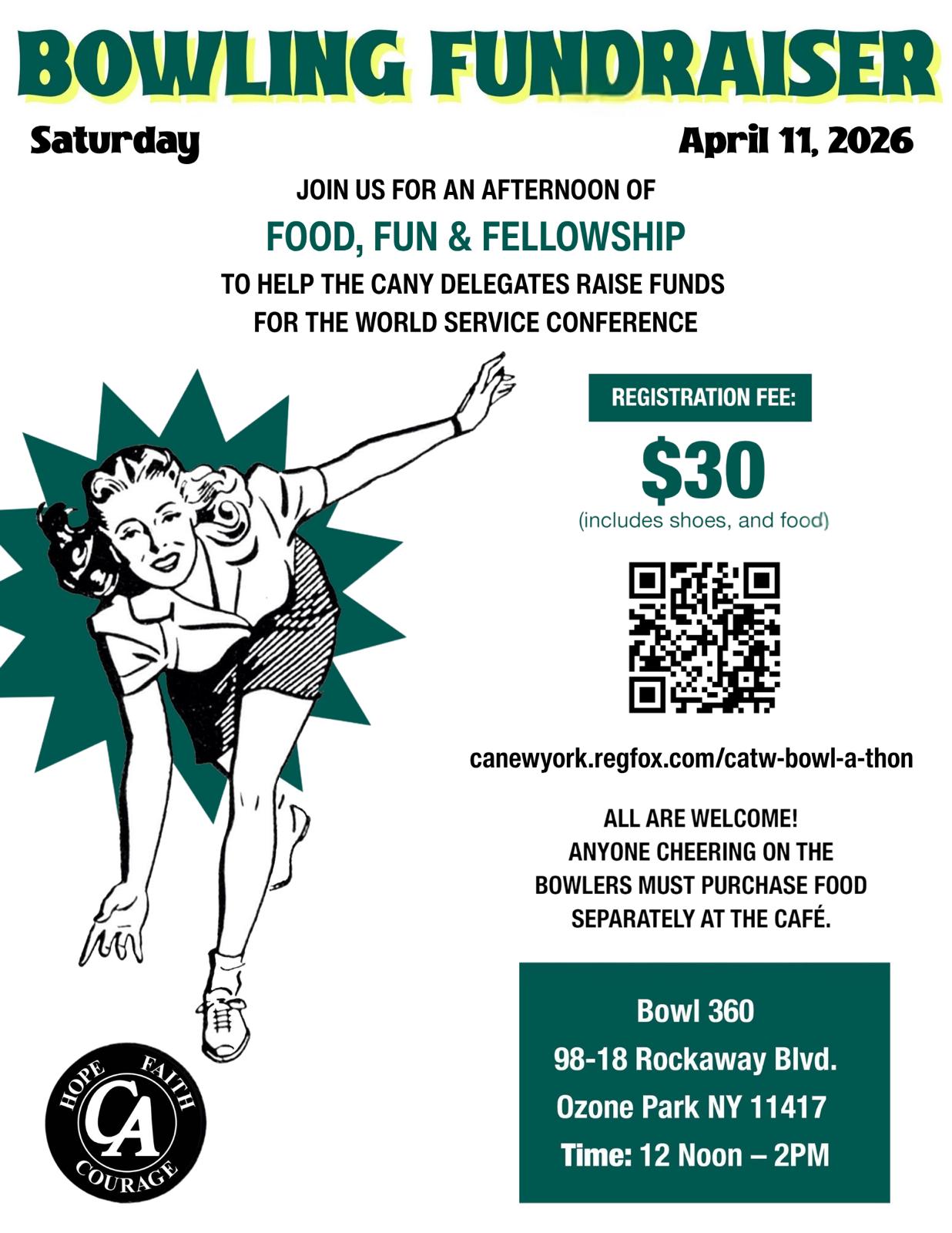 Join us for an afternoon of food, fun & fellowship to help the CANY Delegates raise funds for the World Service Conference. Registration Fee: $30 (includes shoes and food)