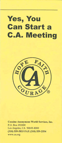 If there are no other C.A. meetings nearby, you can obtain a Starter Kit from the Cocaine Anonymous World Service Office via the contact information on the front of this pamphlet. Starter Kits include literature, chips, and a suggested meeting format with optional readings. Meeting formats can also be downloaded here.